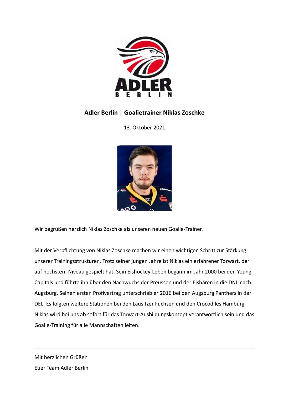 Verpflichtung Goalie-Trainer Niklas Zoschke